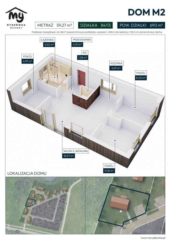 We wnętrzu znajdują się trzy komfortowe pokoje o powierzchni 6,99 m², 8,00 m² i 9,08 m². Mogą one pełnić rolę sypialni, pokoju dziecięcego czy gabinetu do pracy. Centralnym punktem domu jest salon z jadalnią (18,07 m²), który łączy się z funkcjonalną kuchnią (5,69 m²). Jest to serce domu, w którym wygodnie spędzisz czas z bliskimi i zaprosisz gości. Dopełnieniem układu jest łazienka o powierzchni 5,40 m², osobne WC (1,28 m²) oraz praktyczny przedsionek (4,76 m²), który ułatwia codzienne użytkowanie.