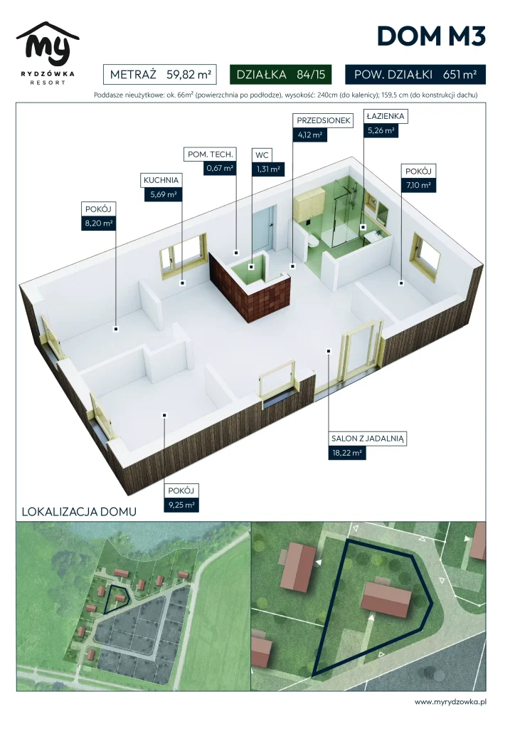 Dom M3 to całoroczny budynek o powierzchni 59,82 m², zlokalizowany na działce o powierzchni 651 m². Jest to propozycja dla osób, które szukają balansu między wygodą użytkowania a umiarkowaną wielkością gruntu. Dom został zaprojektowany tak, aby w pełni wykorzystać każdy metr kwadratowy i zapewnić komfortową przestrzeń dla rodziny lub osób planujących pobyty rekreacyjne na Mazurach.