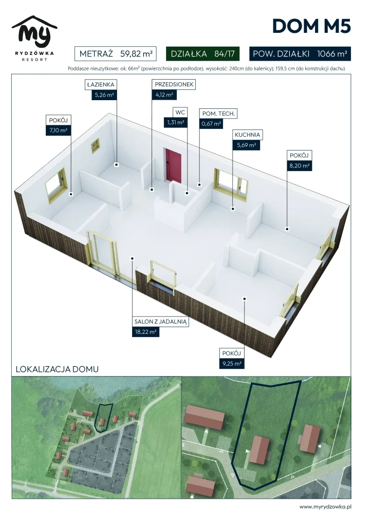 Dom M5 to wyjątkowa propozycja dla osób, które marzą o przestronnym ogrodzie i swobodzie aranżacji terenu – działka o powierzchni 1066 m². Na tak dużej powierzchni można stworzyć miejsce do wypoczynku, uprawy roślin czy strefę prywatnej rekreacji. Sam budynek, o powierzchni 59,82 m², został zaprojektowany z myślą o wygodzie użytkowania.