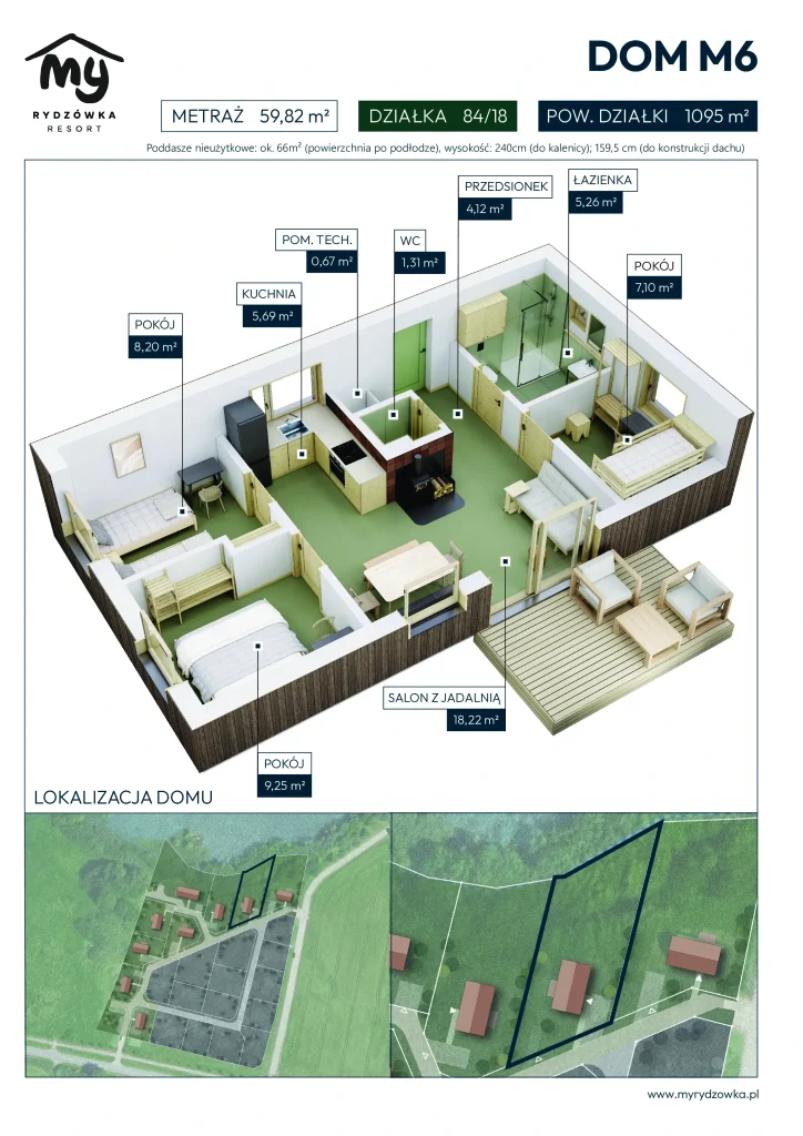 W środku znajdują się trzy pokoje (7,10 m², 8,20 m² i 9,25 m²), przestronny salon z jadalnią (18,22 m²), kuchnia (5,69 m²), łazienka (5,26 m²), osobne WC (1,31 m²), przedsionek (4,12 m²) oraz pomieszczenie techniczne. Wszystko to sprawia, że dom jest wygodny w codziennym użytkowaniu i funkcjonalny przez cały rok.