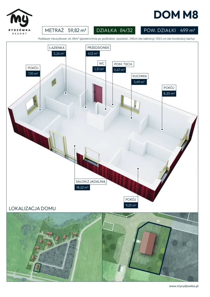 Dom M8 to przytulny budynek o powierzchni 59,82 m², zlokalizowany na działce o powierzchni 499 m². Jest to propozycja dla osób, które szukają funkcjonalnego domu z bardziej kompaktowym ogrodem, łatwiejszym w pielęgnacji. Nieruchomość idealnie sprawdzi się zarówno dla par, rodzin, jak i dla inwestorów planujących wynajem krótkoterminowy w atrakcyjnym regionie.