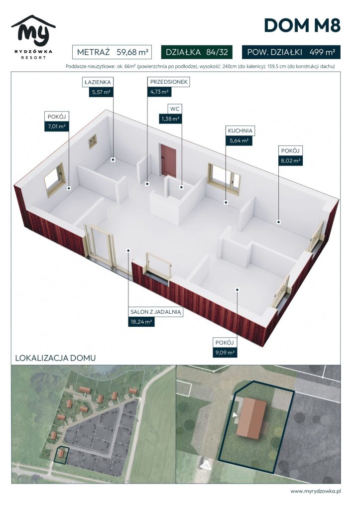 Dom M8 to przytulny budynek o powierzchni 59,68m², zlokalizowany na działce o powierzchni 499 m². Jest to propozycja dla osób, które szukają funkcjonalnego domu z bardziej kompaktowym ogrodem, łatwiejszym w pielęgnacji. Nieruchomość idealnie sprawdzi się zarówno dla par, rodzin, jak i dla inwestorów planujących wynajem krótkoterminowy w atrakcyjnym regionie.